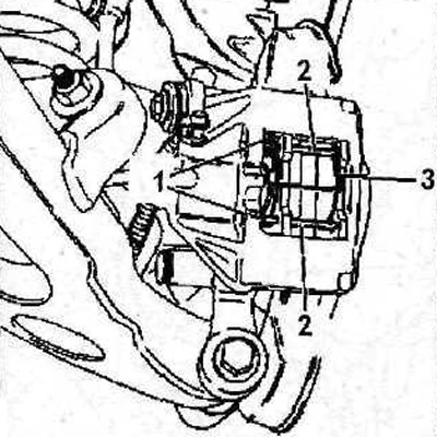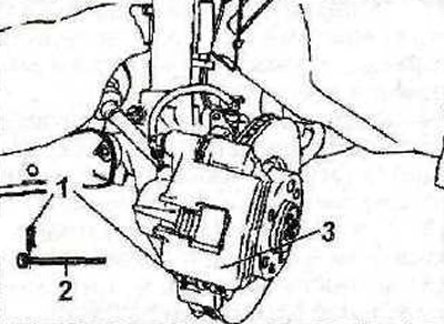 2. Извлеките шплинт 1 и вывинтите болт 2 крепления суппорта 3 (см. иллюстрацию).