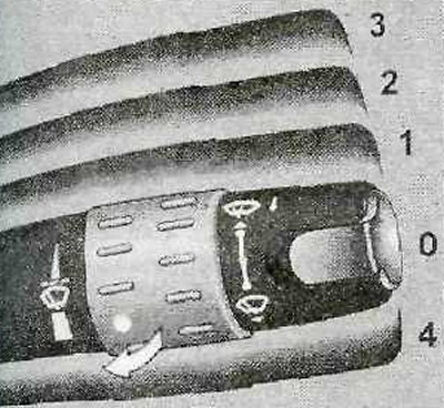 - 1 - интервальный режим работы. Поворотом выключателя на подрулевом рычаге можно выбрать нужный интервал;