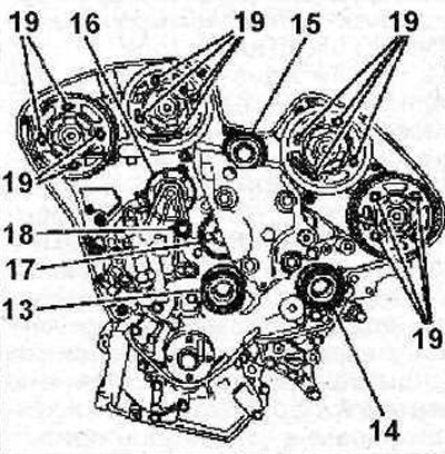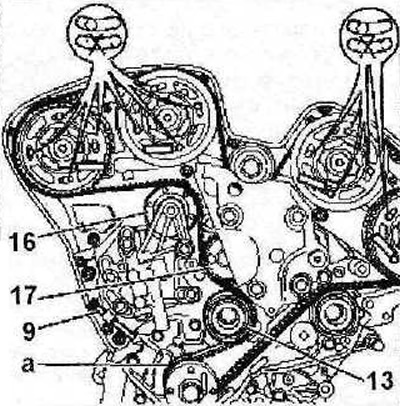 31. Уложите зубчатый ремень на ролик 16, шестерню 17 водяного насоса и ролик 13 (см. иллюстрацию 2.31).
