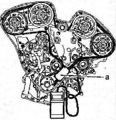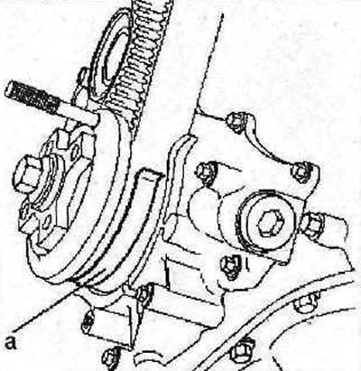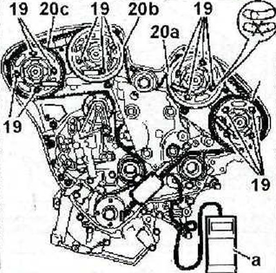 38. Снимите прибор «а» для измерения натяжения ремня (см. иллюстрацию 2.37), извлеките упоры которые использовались для блокировки распределительных и коленчатого валов.