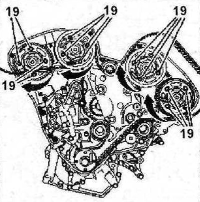 24. Проверьте легкость хода шестерен распределительных валов, предварительно повернув их по часовой стрелке так, чтобы болты крепления шестерен находились по центру удлиненных отверстий, а не упирались в их концы (см. стрелки на иллюстрации). Затяните болты 19 крепления шестерен с усилием 5 Нм, а затем доверните их на 45°.