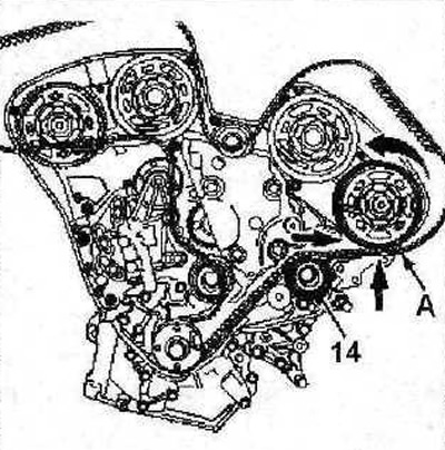 27. Убедитесь, что отрезок ремня А между роликом 14 и шестерней распределительного вала натянут должным образом (см. иллюстрацию 2.25).