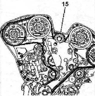 29. Уложите зубчатый ремень на шестерню распределительного вала впускных клапанов левого блока цилиндров, ролик 15 (см. иллюстрацию).