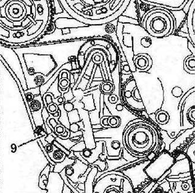 32. Снова ввинтите болт 9 (см. иллюстрацию 2.31), чтобы обеспечить должное натяжение ремня. Убедитесь, что болты крепления шестерен распределительных валов находятся по центру удлиненных отверстий, а не упираются в их концы. Если болты находятся не по центру, то процедуру укладки зубчатого ремня следует повторить.
