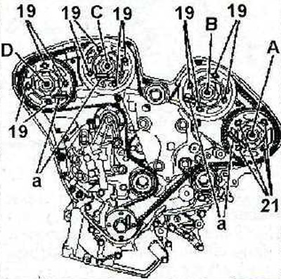 47. Застопорите шестерни распределительных валов А и В, воспользовавшись подходящими упорами «a» (см. иллюстрацию). Если упоры нельзя беспрепятственно установить в соответствующие отверстия, то ослабьте затяжку болтов 19 крепления шестерен на 45°, а затем вставьте упоры в отверстия.