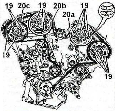 37. Затяните болты 19 крепления шестерен распределительных валов с усилием 10 Нм в следующей последовательности сначала болты 19 крепления шестерни 20, затем — шестерни 20а, затем — шестерни 20b и шестерни 20с (см. иллюстрацию).