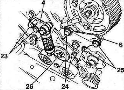 26. При необходимости поверните шестерню распределительного вала против направления вращения двигателя, чтобы совместить зубцы ремня с пазами шестерни (см. стрелки на иллюстрации 2.25).