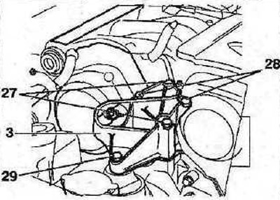 58. Установите правую опору 3 подвески двигателя, затяните болты 27 и гайки 28 и 29 ее крепления с усилием 45 Нм (см. иллюстрацию).