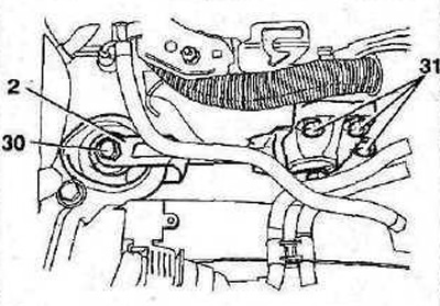 2.58 Установите правую опору 3 подвески двигателя, затяните болты 27 и гайки 28 и 29 ее крепления с усилием 45 Нм