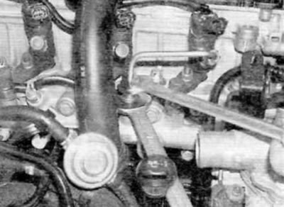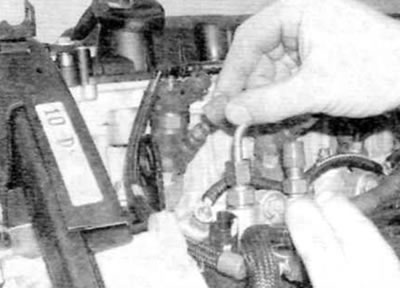 8. Тщательно очистите штуцеры топливопроводов высокого давления на топливной рампе, топливном насосе и форсунках. С помощью рожкового ключа отверните накидные гайки крепления топливопроводов высокого давления к топливному насосу и топливной рампе. При отвинчивании накидных гаек придержите штуцеры на насосе и топливной рампе вторым гаечным ключом. Снимите топливопровод высокого давления и заглушите открытые соединения во избежание проникновения грязи.