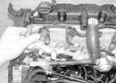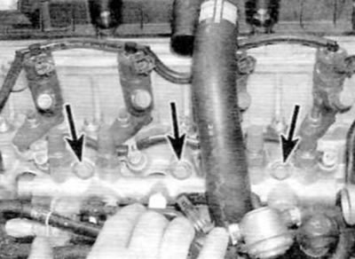 11. Выверните три болта крепления топливной рампы к головке цилиндров и снимите направляющую со штатного места (рис. 16.11, а, б).