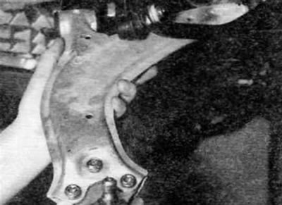 5. Забийте малко длето в слота на кормилния колян, за да разширите леко слота, за да позволите отстраняването на щифта на сферичния шарнир. Отстранете вътрешния край на рамото от подрамката и освободете сферичния шарнир от кормилния колян. Отстранете защитната пластина, разположена върху щифта на сферичния шарнир.