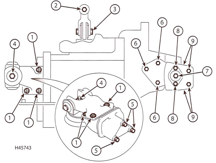 41. Когато сглобявате, монтирайте задния опорен възел върху задната част на цилиндровия блок и затегнете съответните болтове до определения въртящ момент. Монтирайте полуоската, както е описано в глава 8.
